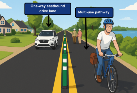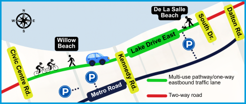 - A seasonal one-way eastbound lane for vehicles and a seasonal separated multi-use pathway between Civic Centre Road and South Drive for pedestrians and cyclists
